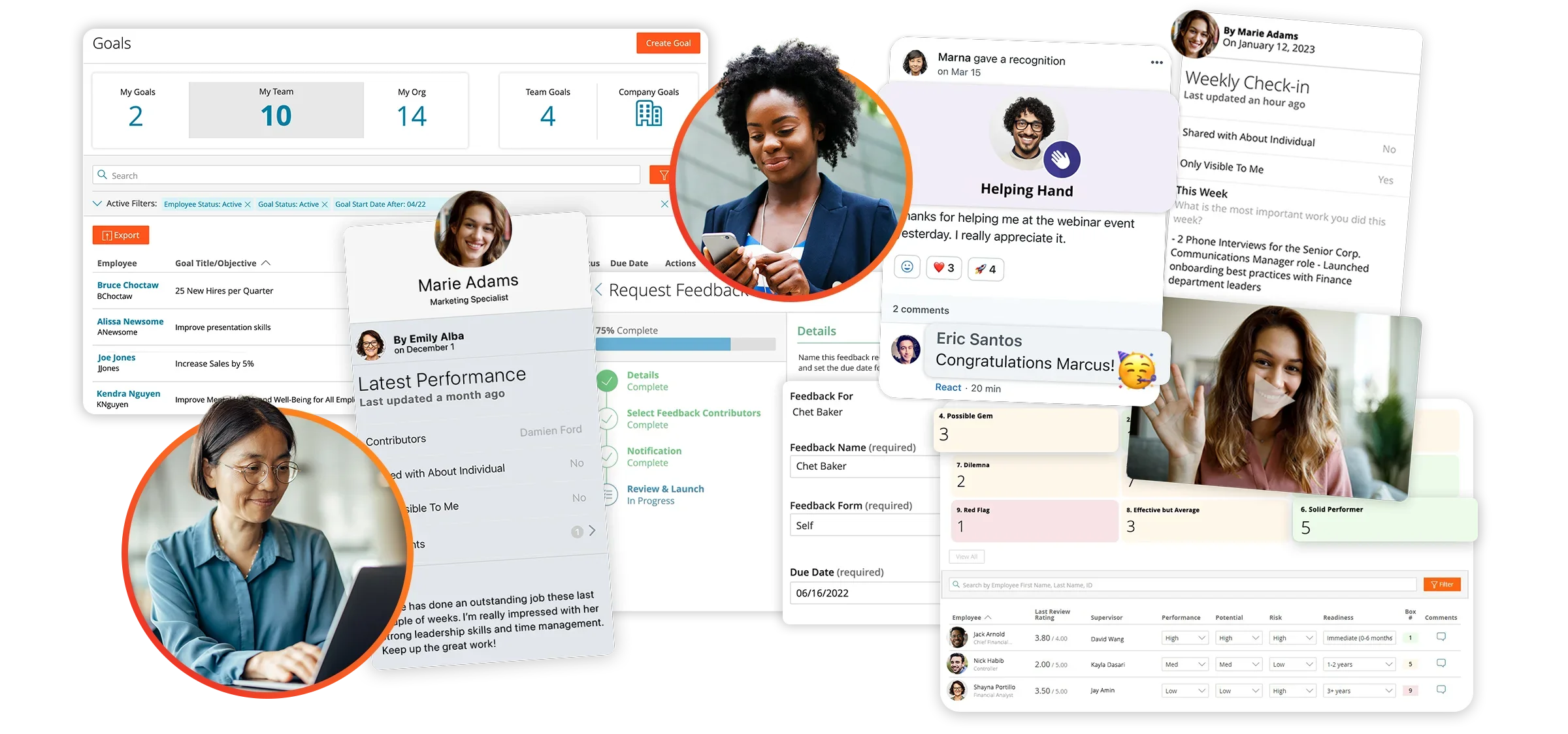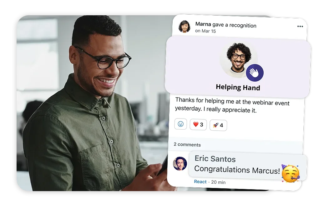 Use customizable feedback forms to request performance feedback at any time, from anyone including peers, managers, and direct reports. Peer recognition automatically surfaces in reviews, so it is easy to get a holistic view.