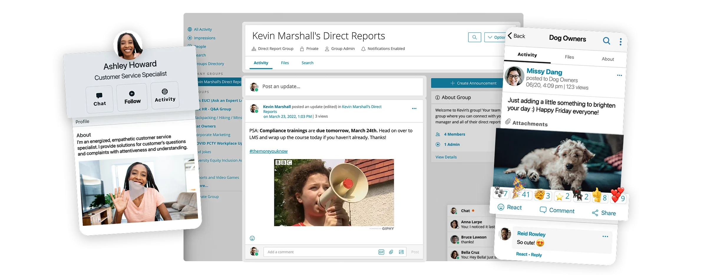 Learn about your colleagues with user profiles and connect on projects, interests, and initiatives across teams, levels, and locations with discussion groups.