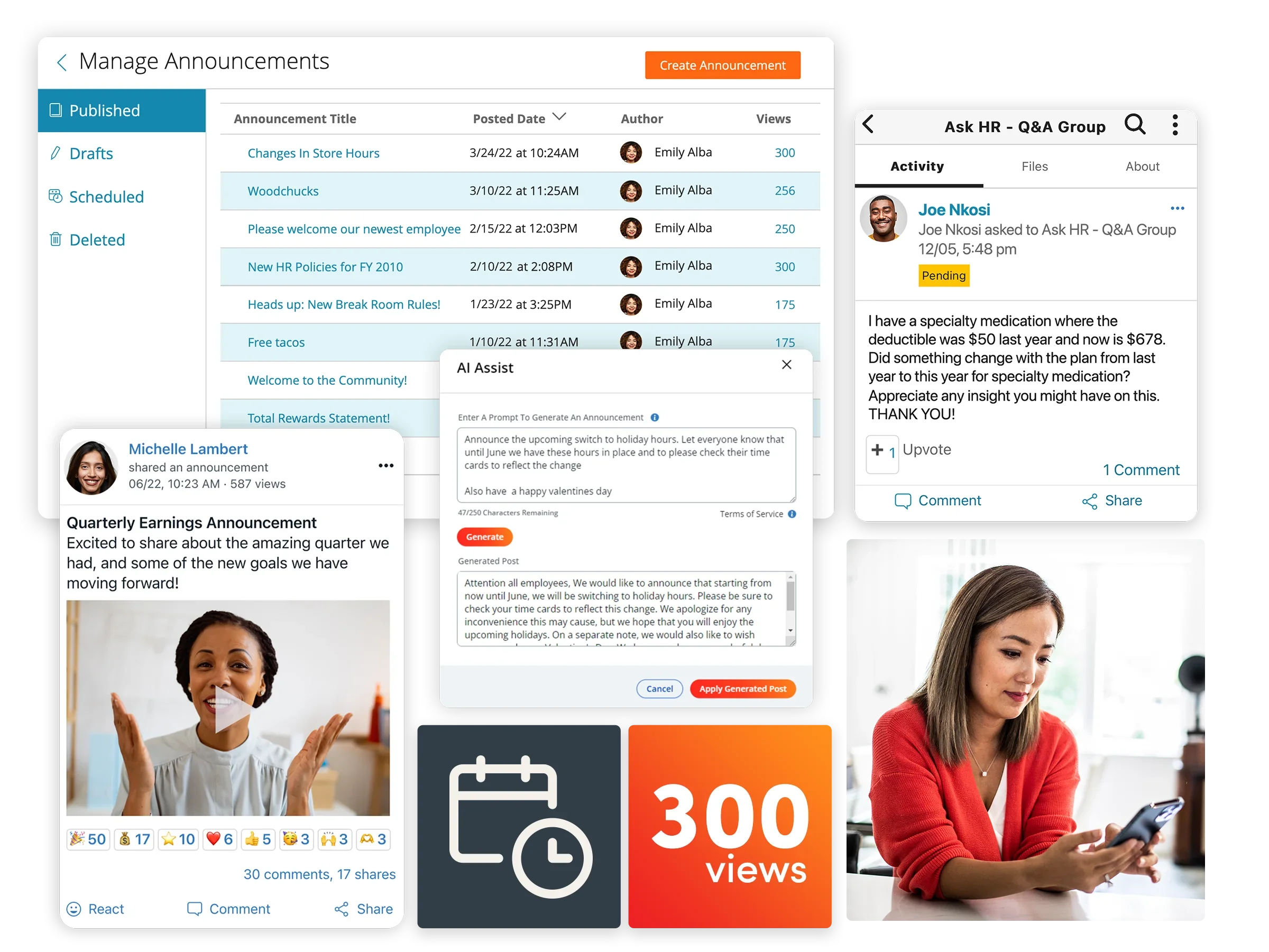 Quickly generate announcements by entering a prompt into AI Assist and then share the post with group members in just a few clicks. By calibrating the tone of announcements or even translating them into other languages to reach multilingual employees, AI Assist helps your message land and increases transparency across your organization.