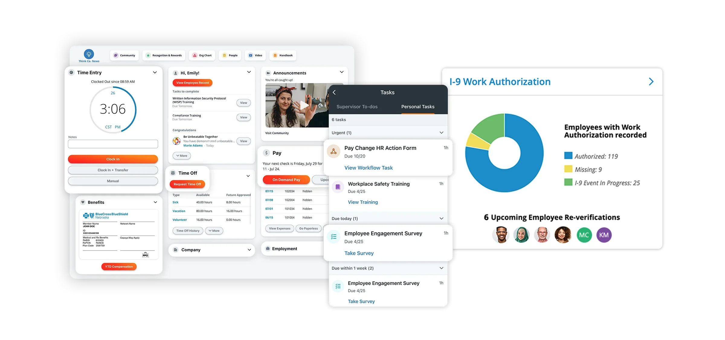 Paylocity’s intuitive, cloud-based modern workforce solution is an all-in-one platform that goes beyond what standard HR software solutions provide. Our suite helps build a curated engagement experience before your employees’ first day with a focused approach on learning and development, communication, and connection. We partner with you from day one to deliver on your unmet needs so you can get back to what matters most – your people.